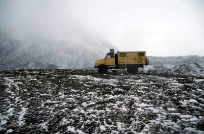 Schneeverwehungen. Die Sichtweite ist fast Null....wir müssen aussteigen und