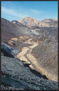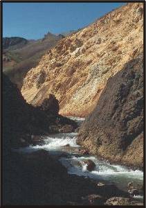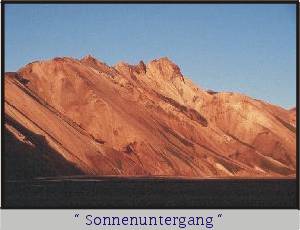 Irgendwann in der Nacht trudeln Günter und Brit unbeobachtet ein und pünktlich zum Frühstück ist auch Uwe wieder bei uns. Heute ist faulenzen angesagt! Zuerst bezwingen Jürgen, Brit, Pit und ich den Bláhnúkur (943m hoher grüner Berg) und sehen uns die Landmannalaugar von oben an. Man hat eine tolle Weitsicht über die nähere Umgebung und die typischen Farben der Rhyolithberge in dem gleißenden Sonnenlicht. Es ist fast unerträglich warm! In kurzer Hose und T-Shirt hole ich mir meinen ersten Sonnenbrand! Als wir wieder nach unten kommen, liegt Güter schon im Hot - Pot. Wir folgen unauffällig und legen uns dazu. Den Kopf in eines der Mooskissen gebettet, lässt es sich gut aushalten. Erst als wir schon Schwimmhäute ansetzen und total verschrumpelt aussehen, verlassen wir das warme Nass.