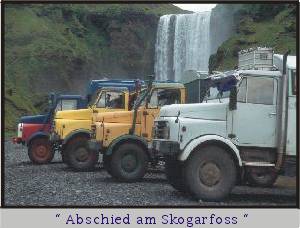 Günter ist schon sehr früh zum Flughafen gefahren um Brit zum Flieger zu bringen. Wir anderen treffen ihn später zwecks Gepäckabgabe dort wieder. Es ist ein typischer Freitag der 13., wie es ihn wohl nur in Island geben kann. Zuerst will man uns weiß machen, das unser Rückflug nicht existiert. Dann erhalten Pit und Karin eine "Knolle" wegen Falschparken und uns will man nicht mehr weiter fahren lassen, weil unsere Steuerplakette angeblich abgelaufen ist. Und zu guter letzt fährt dem Günter ein Mercedes hinten drauf - oder war es etwa andersherum !? Schweren Herzens geben wir unsere Hanos wieder im Zoll ab und machen uns auf zum "Dubliner". So recht kann sich noch keiner an den Gedanken gewöhnen Island zu verlassen. Das einzige, was uns bleibt als wir im Flieger sitzen und auf die dahinschwindende Insel unter uns zurück blicken, ist die Gewissheit das wir alle wieder kommen werden. Denn für uns alle gilt inzwischen: