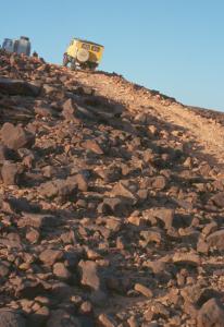 Oben auf dem Plateau treffen wir tatsächlich die zwei schwerbeladenen LKWs von heute Mittag wieder. Also besteht doch eine Verbindung zu der anderen Piste....