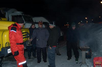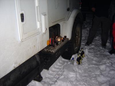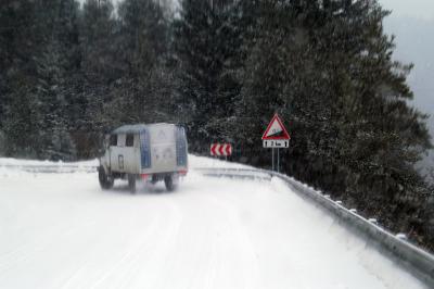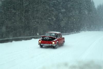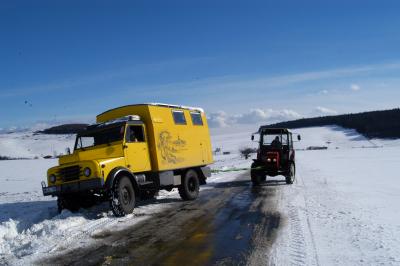 Wir waren gerade los gefahren, als uns nach 500m ein eben solches Vehikel entgegen kommt. Wir wendeten bei der nächsten Möglichkeit und fuhren zurück. Jürgen hat ihn sofort "eingefangen" und dem Treckerfahrer den "Bergeschlupp" angehängt und keine 5Minuten später stand unser Hano wieder auf der vereisten Straße. Noch bevor wir uns richtig bedanken konnten hatte dieser nette Mensch gewendet und war verschwunden. Es muss sich wohl um eine "Erscheinung " der "Tatra-Geister" gehandelt haben!?