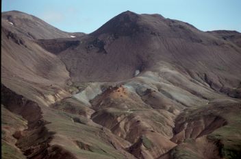 mit Blick auf den braunen Sandfell und den grünen Rjúpnafell. Die Sonne ziert