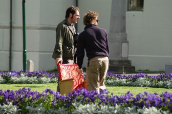 junge Männer, die einen alten Sessel versuchen ins rechte Sonnenlicht zu